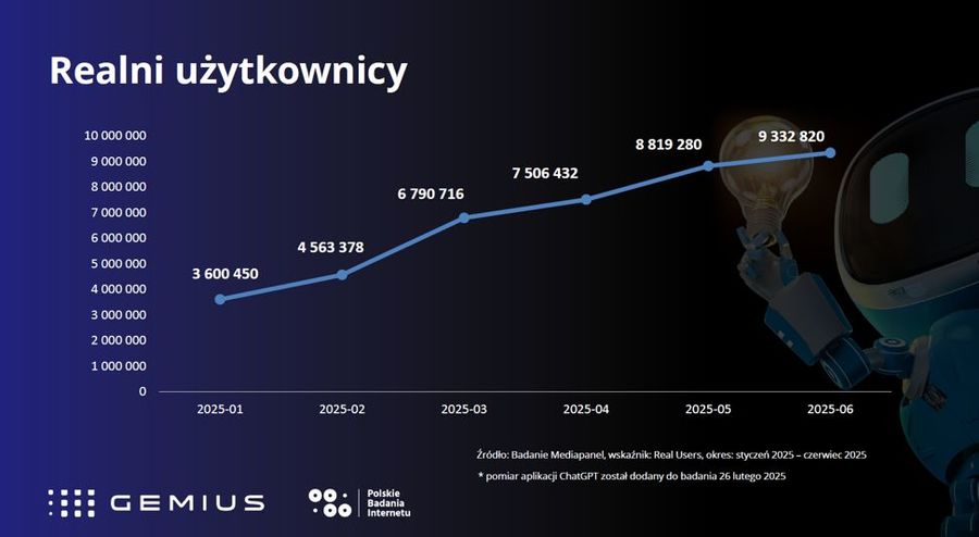 Pierwsze półrocze 2025 roku pokazuje, że generatywna sztuczna inteligencja nie jest już zjawiskiem niszowym w Polsce, a narzędzia takie jak ChatGPT stają się elementem codziennego życia milionów internautów. Technologia, która jeszcze niedawno była wykorzystywane przez entuzjastów, w ciągu kilku miesięcy trafiła do masowego odbiorcy, wyznaczając nowy standard w sposobie pozyskiwania informacji i interakcji online. – komentuje twórca analizy, Bartosz Wójcik.