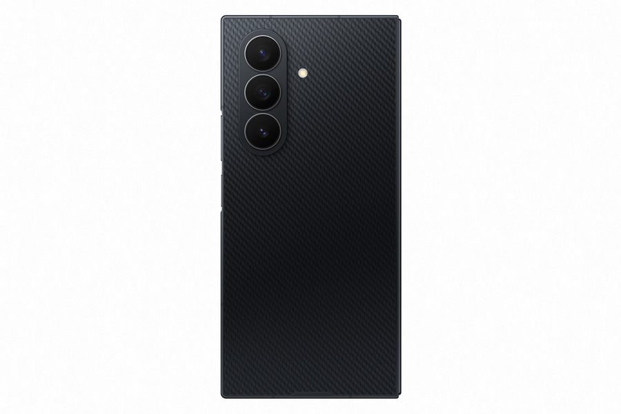Smukły Galaxy Z TriFold w pozycji złożonej, z jednolitym, ciemnym wykończeniem crafted black, potrójnym aparatem z teleobiektywem 3x i pojedynczą diodą LED, podkreślający elegancką, odporną konstrukcję z zawiasem Armor FlexHinge.