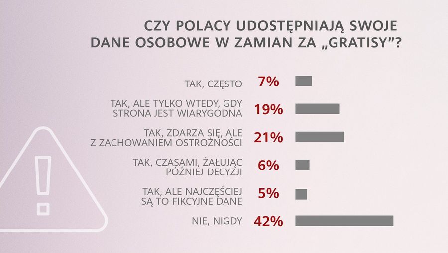 Niemal połowa Polaków (54%) przyznaje, że zdarza im się udostępniać swoje dane osobowe w zamian za darmowe usługi, próbki czy dostęp do aplikacji - choć zwykle pod pewnymi warunkami (np. wiarygodność strony, atrakcyjność usługi).