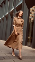 Beżowy garnitur z płynną, rozkloszowaną spódnicą i dopasowaną marynarką to doskonały przykład na to, jak marki premium wykorzystują naturalne odcienie i wysokiej jakości materiały. Detale, takie jak kokarda na marynarce podkreślają dbałość o szczegóły.