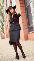 Czarny garnitur z kokardą w talii i dopasowaną spódnicą to przykład na to, jak marki premium łączą klasykę z nowoczesnością. Kapelusz z szerokim rondem dodaje charakteru, a całość uzupełniają czarne rajstopy i eleganckie szpilki. Takie zestawienie podkreśla znaczenie spójności wizualnej, która jest kluczowa dla budowania wizerunku marki premium.