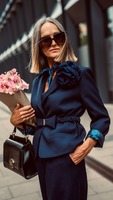 Garnitur w głębokim odcieniu granatu z dekoracyjną kokardą na ramieniu łączy klasyczną elegancję z nowoczesnym designem. Marynarka z subtelnymi, ozdobnymi elementami oraz dopasowana spódnica tworzą harmonijną całość, idealną zarówno na biznesowe spotkania, jak i wieczorne wyjścia. Takie zestawienie pokazuje, jak ważna jest spójność wizualna oraz funkcjonalność, które pozwalają klientkom czuć się pewnie w różnych sytuacjach.