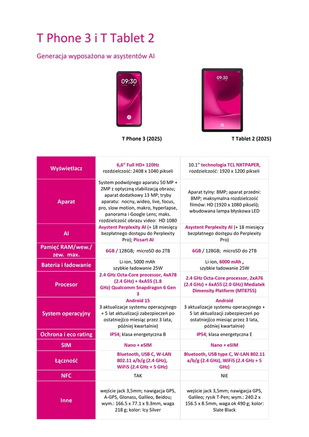 T Phone 3 i T Tablet 2 - zestawienie specyfikacji technicznych Porównanie kluczowych parametrów smartfona T Phone 3 oraz tabletu T Tablet 2, obejmujące informacje o wyświetlaczu, aparatach, funkcjach AI, pojemności pamięci, baterii, procesorach oraz dostępnych opcjach łączności i aktualizacji systemu.