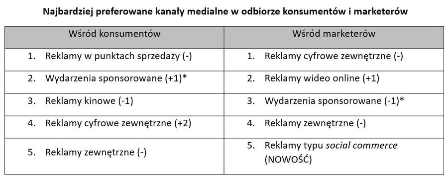Najbardziej preferowane kanały medialne w odbiorze konsumentów i marketerów Konsumenci preferują reklamy w punktach sprzedaży oraz wydarzenia sponsorowane